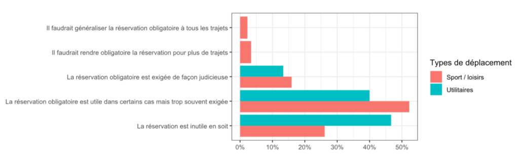 La réservation obligatoire est jugée négativement. Pour 80% des sondé·e·s, elle est soit inutile, soit trop souvent exigée, que ce soit pour les trains ou les bus. Elle est jugée plus durement par les pendulaires : 46% d’entre eux·elles l’estiment inutile et 40% trop souvent demandée. Son prix unique – 2 CHF – semble injuste car il n’évolue pas en fonction de la longueur du parcours. Elle apparaît donc très pénalisante pour les trajets courts.