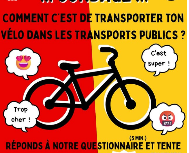 Les CFF donnent des conseils pour transporter gratuitement votre vélo : utiliser un vélo pliable ou le transporter dans une housse. Les remorques sont transportées gratuitement. Dans notre sondage, l’utilisation de la housse apparaît comme anecdotique. PRO VELO Suisse donne également des conseils sur cette page.