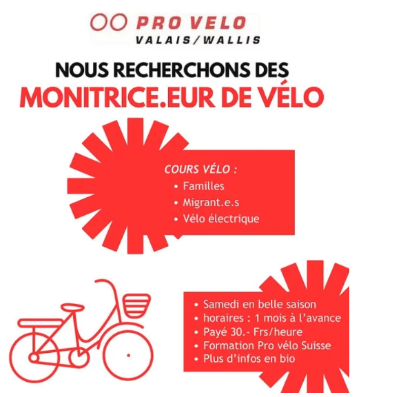 Devenir mono Tu es passioné.e de vélo, tu veux transmettre ta passion, rencontrer d’autres cyclistes, te faire quelques sous. N’hésite pas à rejoindre notre équipe de monitrices et moniteurs vélos ! Contacte nous à l’adresse suivante : cours@pro-velo-valais.ch.