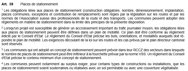 - l’art. 3, que l’appréciation d’intérêts publics supérieurs pouvant être contradictoires peut conduire à une offre en cases de stationnement plus élevée ou plus faible que celle qui serait obtenue en appliquant la norme;