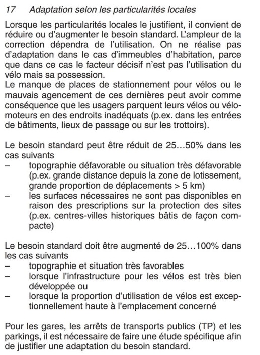 De manière analogue, la norme VSS 40 065 concernant les stationnements pour vélos (elle aussi accessible en ligne, voir ici) contient tout un article (art. 17) dédié aux adaptations selon les particularités locales. Il y a par exemple la possibilité de réduire jusqu’à 50% le nombre de places pour vélos dans certaines conditions (lire l’article ici).